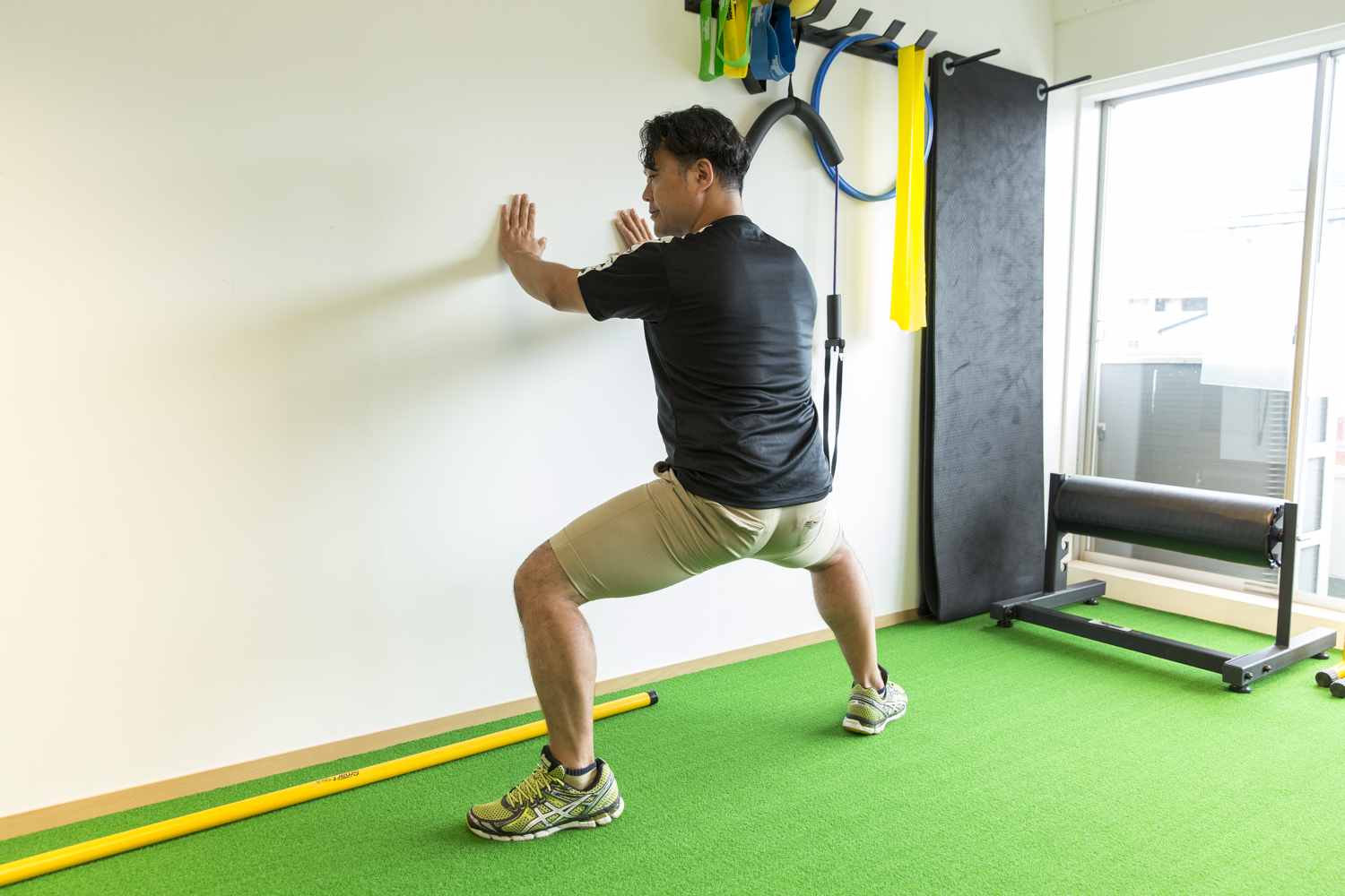 腰幅くらいのスクワットだと腰が反りやすく、内ももが縮んで硬くなりやすい。足幅の広いワイドスクワットだと、腰も反りにくく骨盤をまっすぐ下ろせて、股関節の可動域を使って内ももをしっかり伸ばすことができる。相撲の四股と同じ動作となる。ただし、腰を反らさずにまっすぐ下ろそうとすると、バランスをとるのが難しいので前に棒をつくなど安定させる。これで内転筋をストレッチしながら、大殿筋を鍛えられる。さらにストレッチ効果を高めるために、この状態から上半身をねじっていこう。
