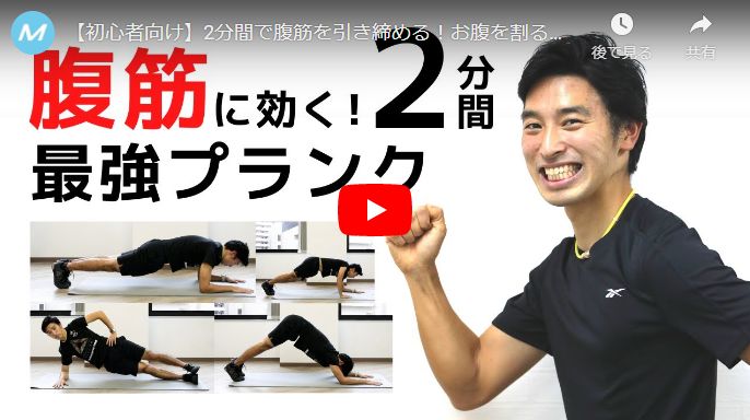 今回は、そんなプランクをメインとした腹筋&体幹強化が期待できる6種目/2分間のトレーニングです。各種目のトレーニング時間は短いので、とにかく自分の限界まで追い込みながらもフォームを意識しましょう。
