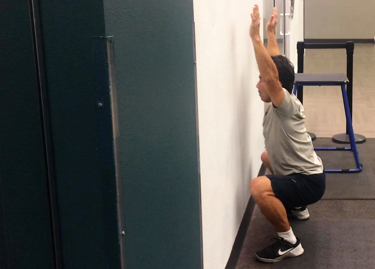 壁に向かって近い位置で立ち、両手を上に伸ばして、ゆっくりした動作でスクワットを行います。壁と体との距離を一定に保ち、体のどの部分も壁につかないようにしましょう。