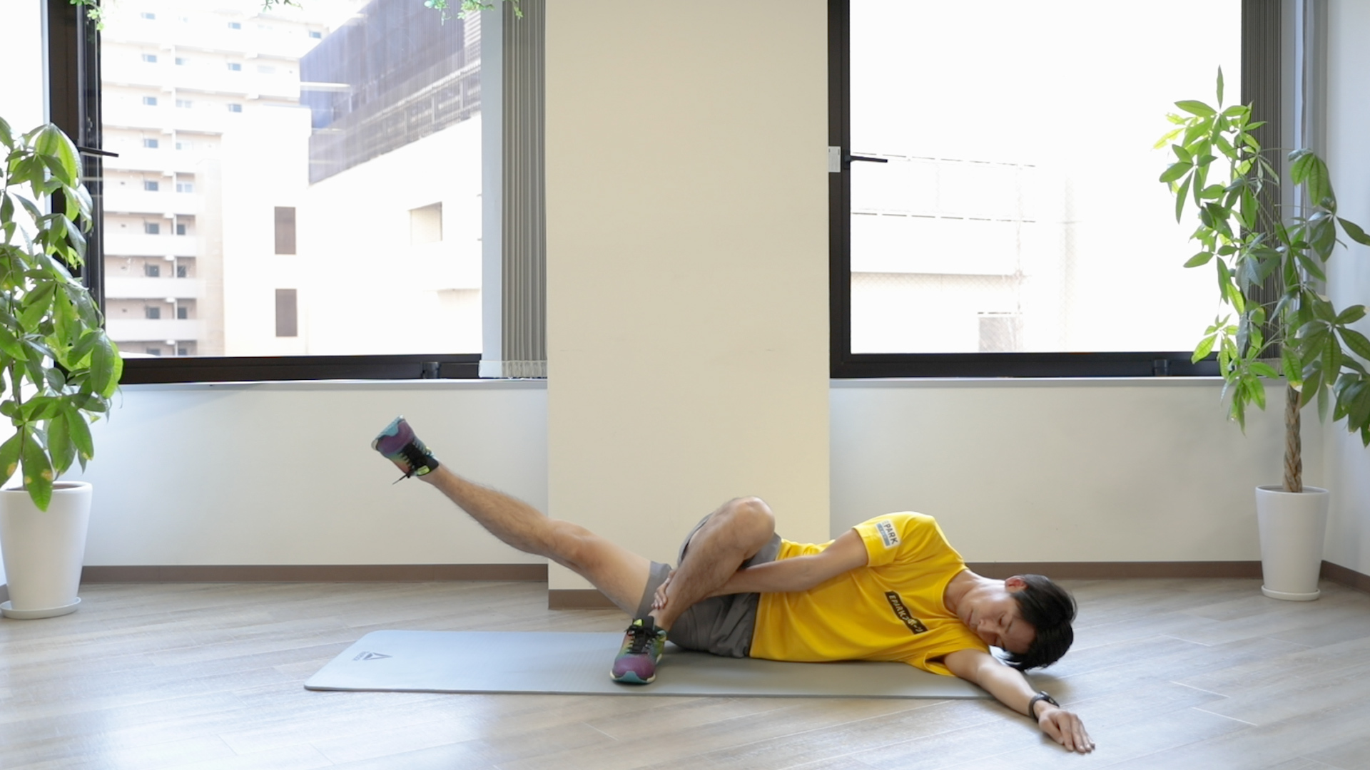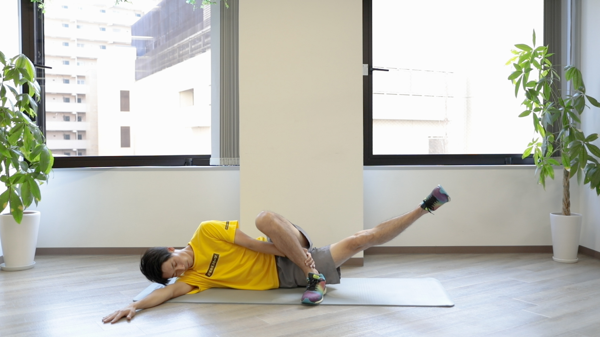 脚痩せをテーマとした寝たままできる5種目/2セットのトレーニングです。各種目のトレーニング時間は短いので、とにかく自分の限界まで追い込みながらもフォームを意識しましょう。