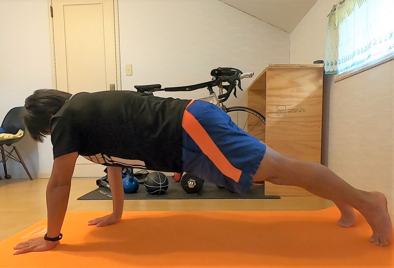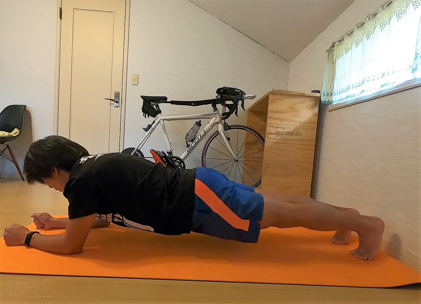 上腕と片足つま先で身体を支え、足の動きでブレないように意識します。上下動もできる限り抑えましょう。