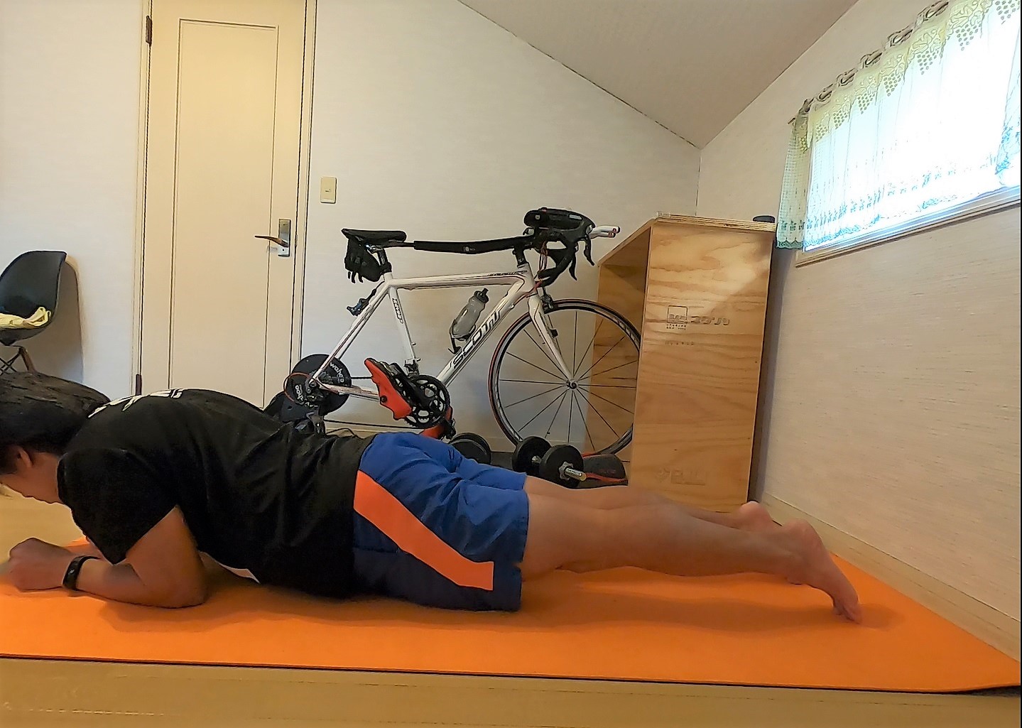 1.両腕を床につけ、つま先で身体を支える。目線は前へ。