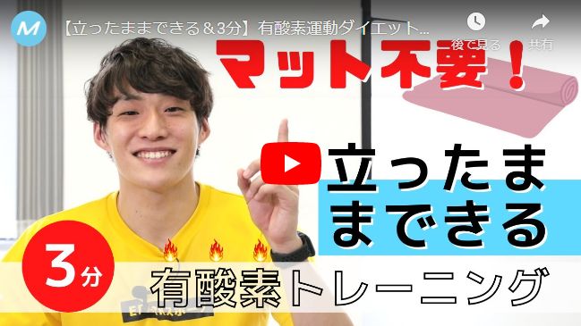 今回は、マットを使わずに立ったままできる有酸素運動トレーニングをご紹介。手軽にダイエットしたい人にとっておすすめの、脂肪燃焼が期待できる8種目/3分間トレーニングです。