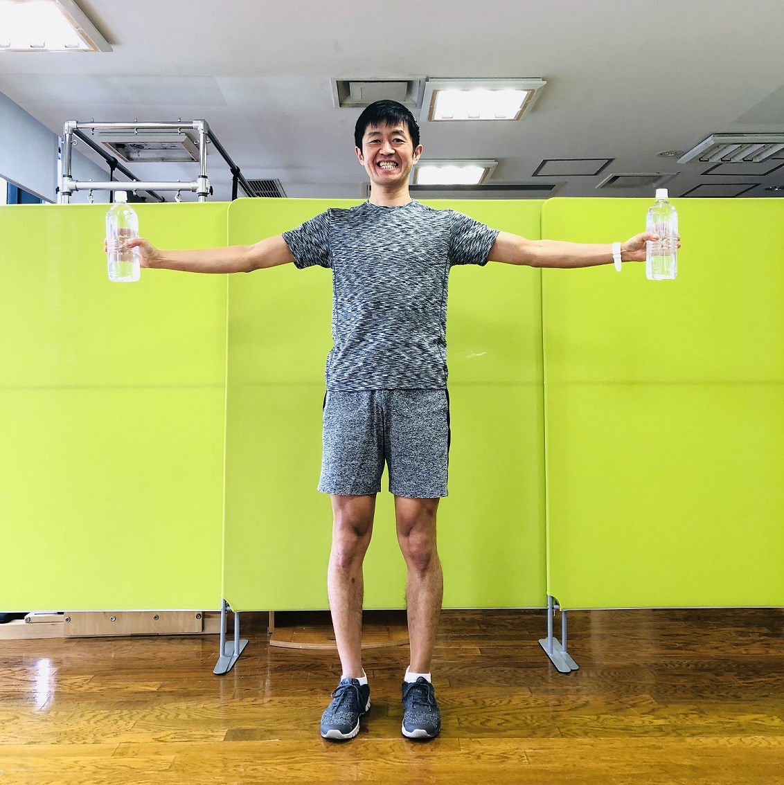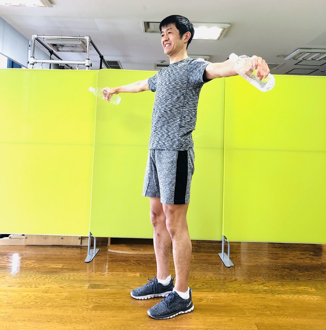 2.片手に1本ずつペットボトルを持ち、ペットボトルを持ったまま両手を広げ、胸の高さと平行になるようにします。足は腰幅から肩幅に開きましょう。