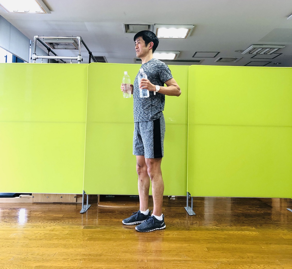 5.肘を伸ばしてペットボトルを胸の延長線上に保ち、片足ずつ股関節を最大に曲げても効果があります。