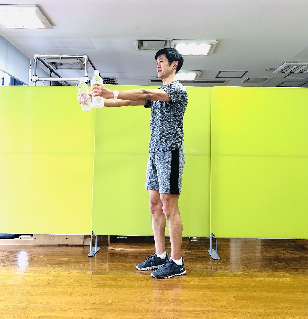 3.引き寄せたペットボトルを、肘を伸ばしながら胸の前に押し出します。