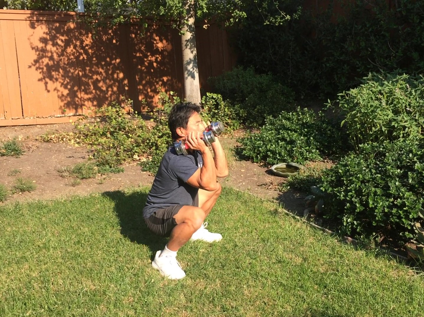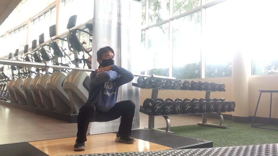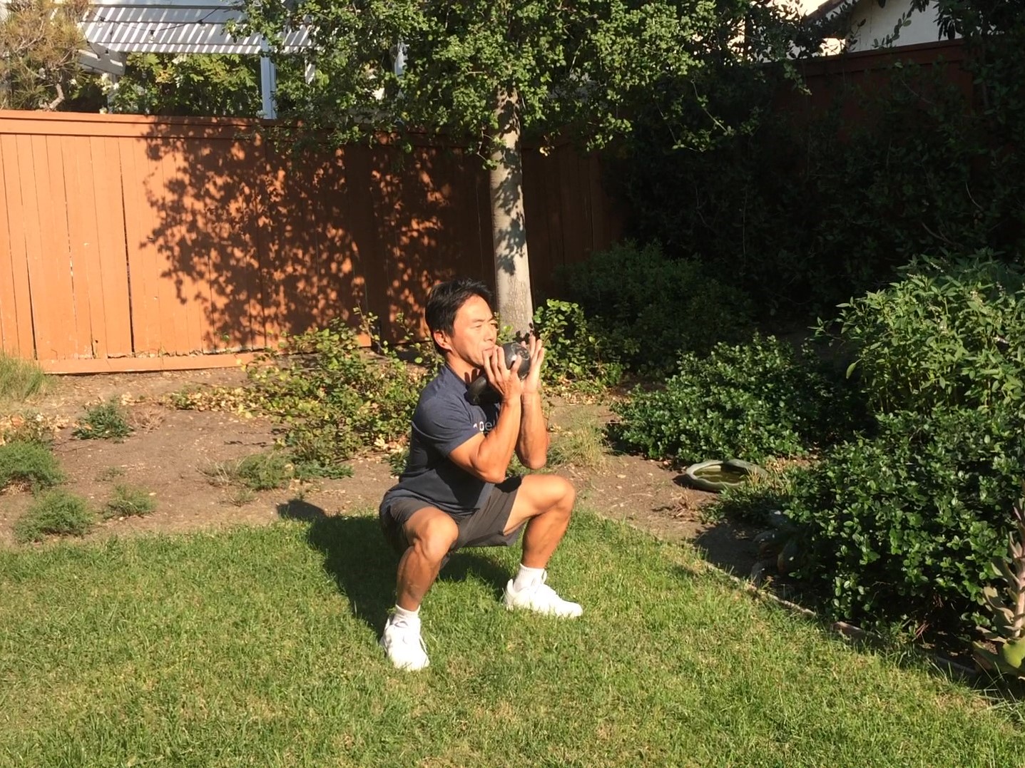 フロントスクワットをできる範囲内で繰り返し行いましょう。可動域が少しずつ広がっていきます。本来、正しい筋トレは柔軟運動でもあるのです。
