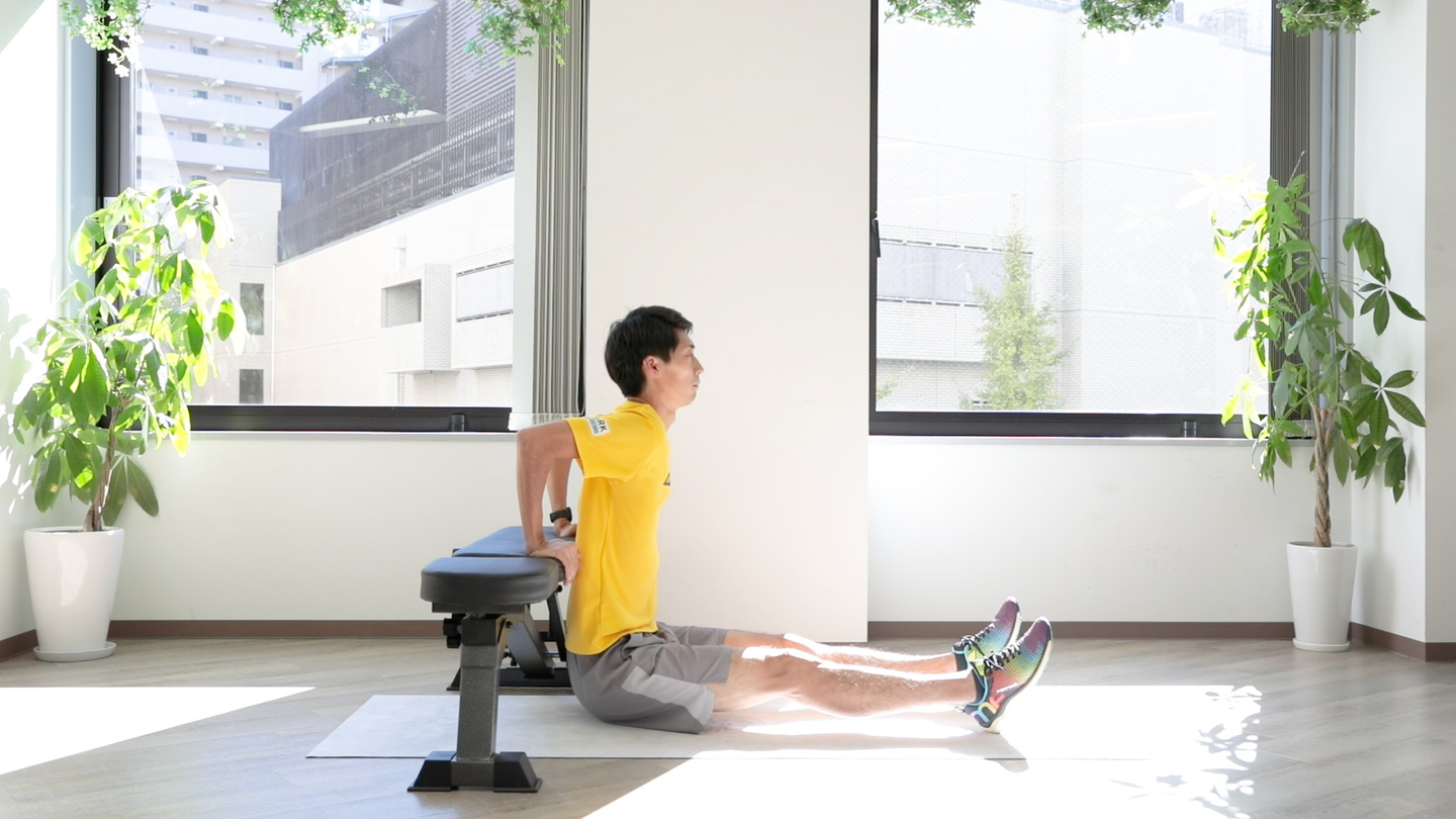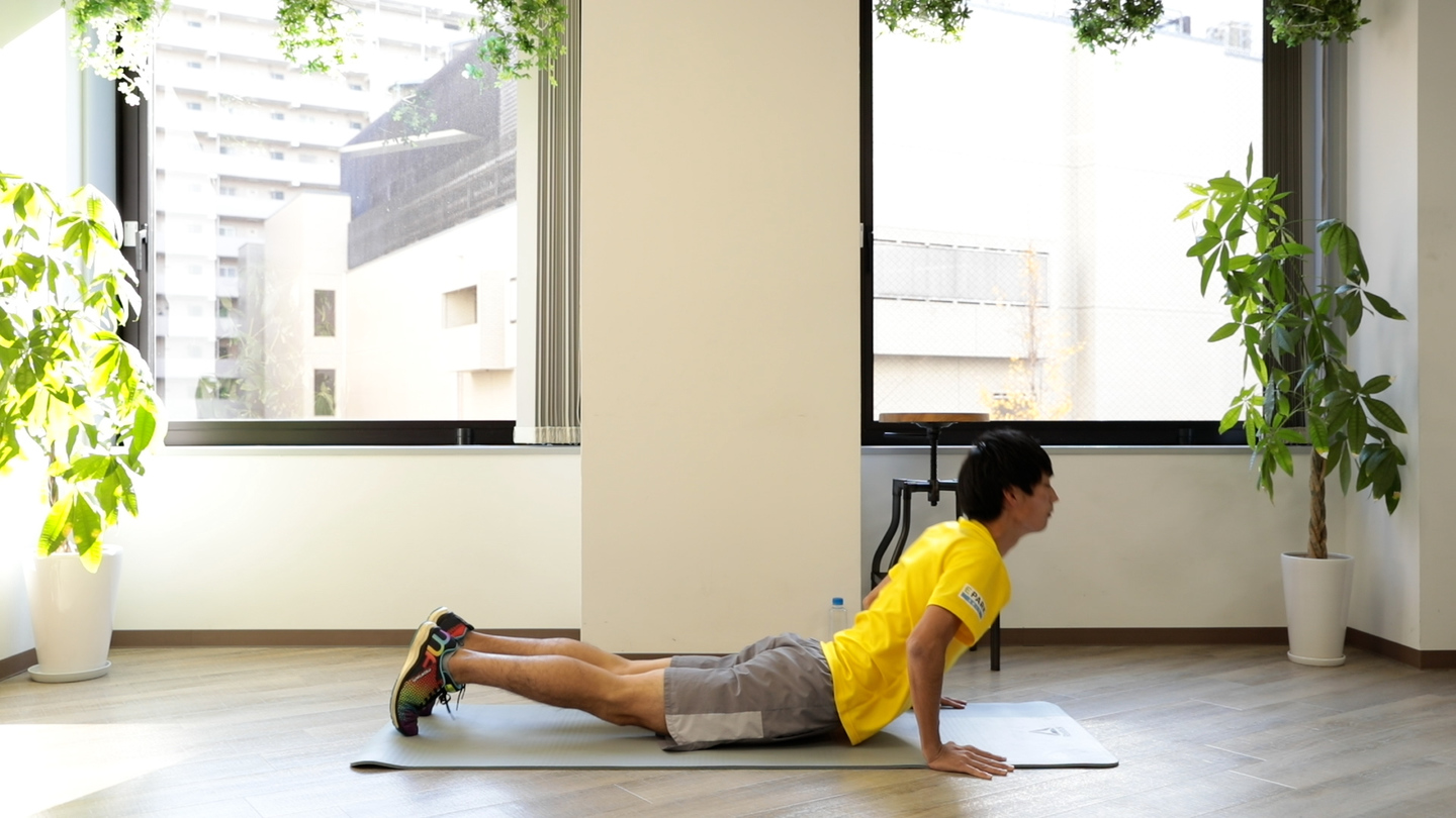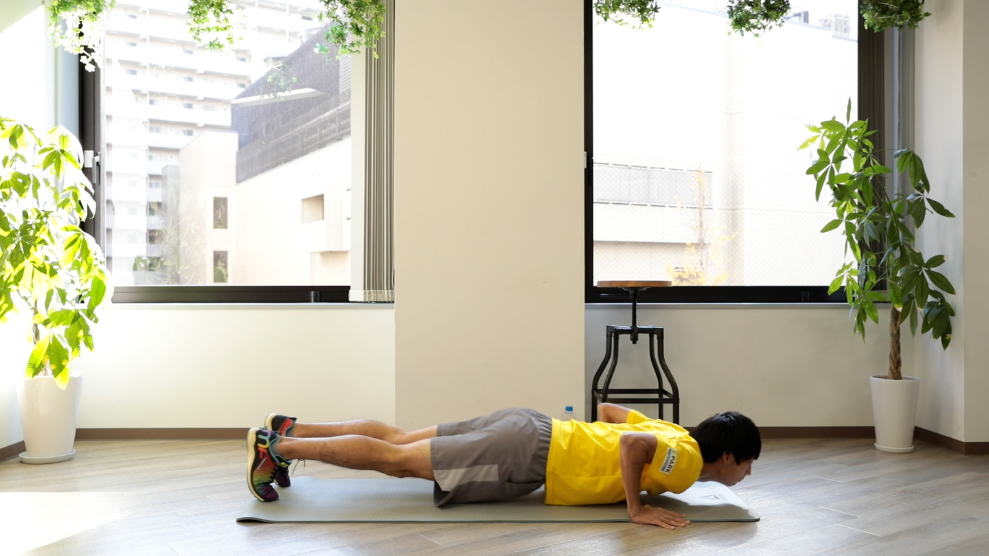 - お尻を浮かせ、足を遠くに伸ばして体を下ろしていく