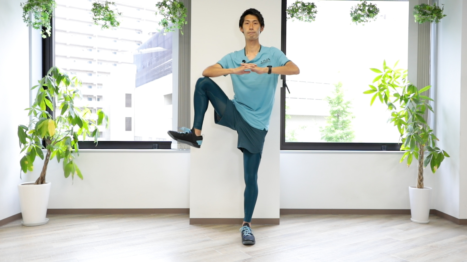 | ポイント | ・足の筋力ではなく、股関節から上げる意識で ・一定のリズムで、バランスは崩さない ・毎回足を高く上げる ・呼吸を忘れずに、吸って吐いてを繰り返す ・膝を肘にしっかり当てる |