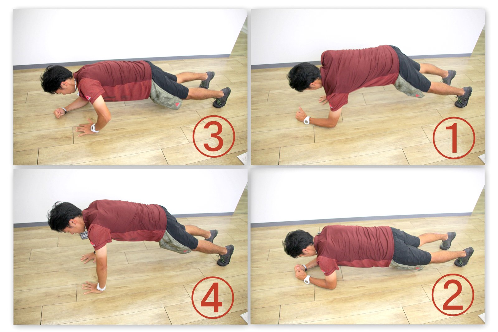 肘を伸ばして身体を起こした体勢と、プランクの体勢を繰り返します。