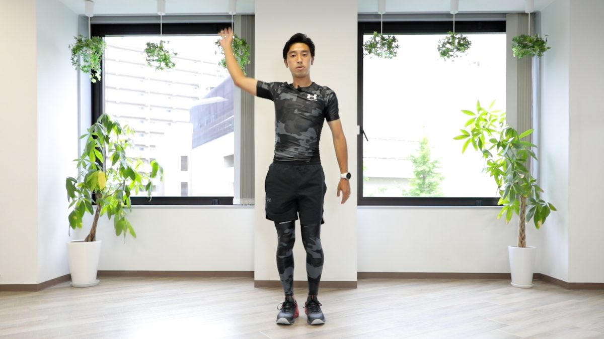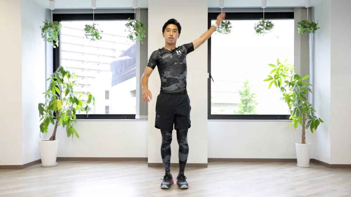 2.腕は後ろから大きく回して、手と反対のつま先とタッチする。