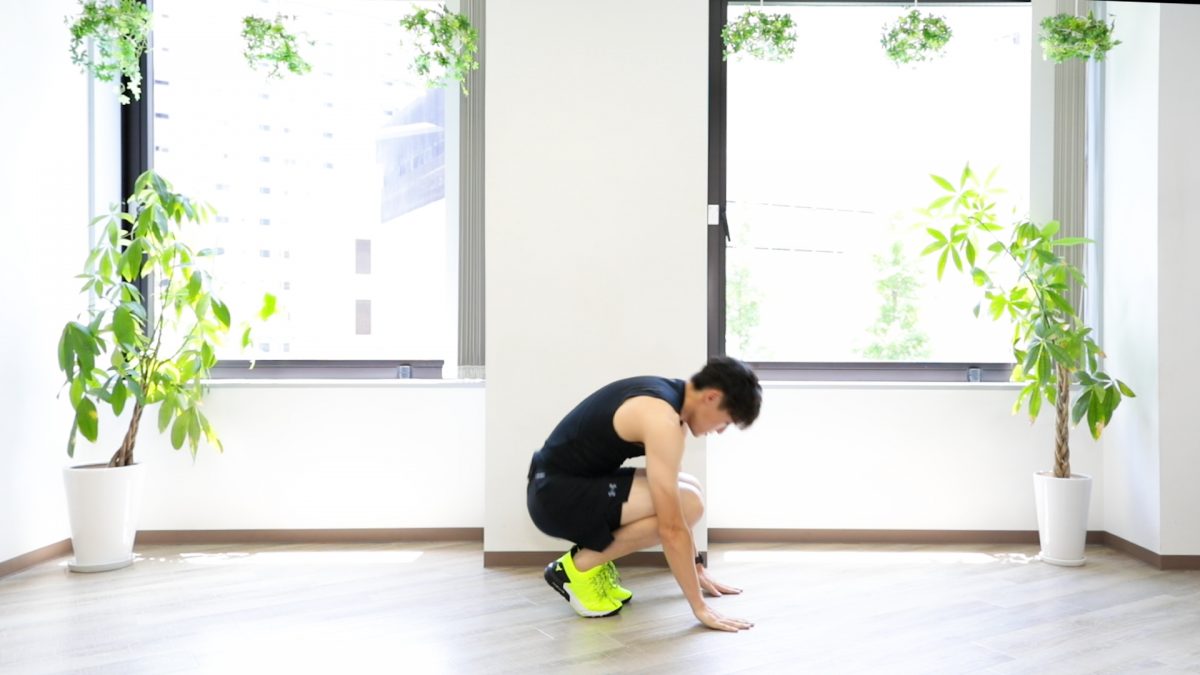 3.再び片足ずつ引き戻し、元のしゃがむ姿勢に戻る。