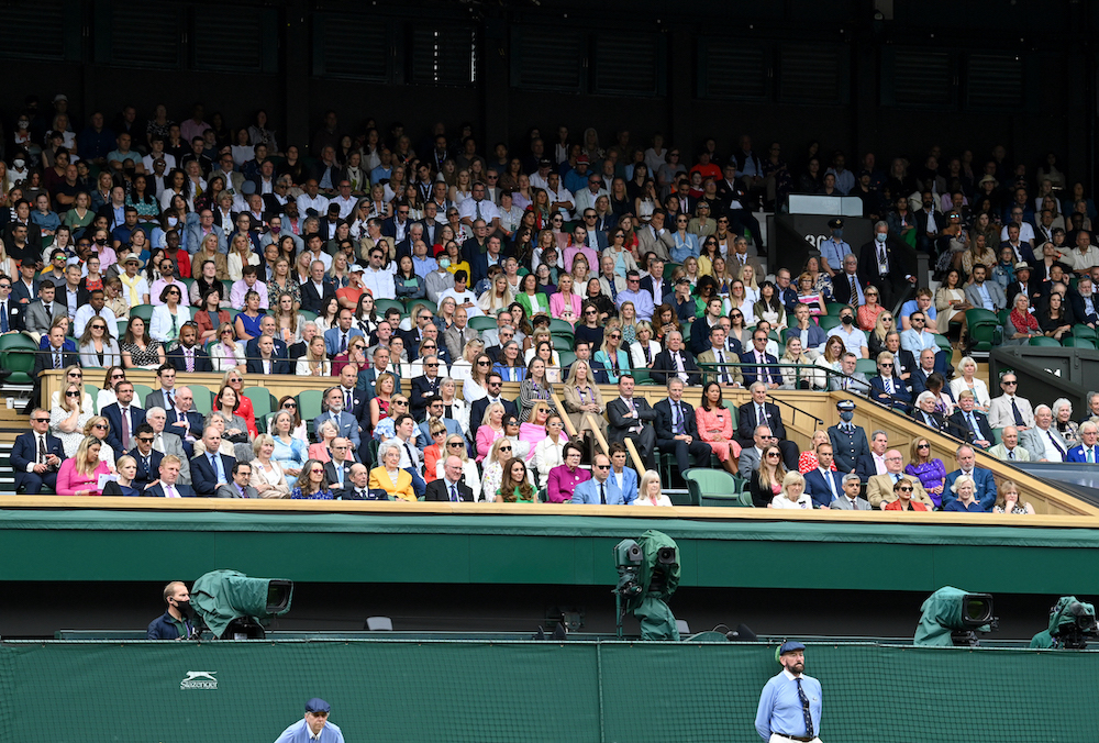 映し出される観客席は満員。観客数を絞ってスタートしたウィンブルドンですが、セカンドウィークの火曜(現地時間の7月6日)からフルで観客を入れるようになりました。ほとんどの人はノーマスク。マスクをしている人は探さないと見つからないほどです。