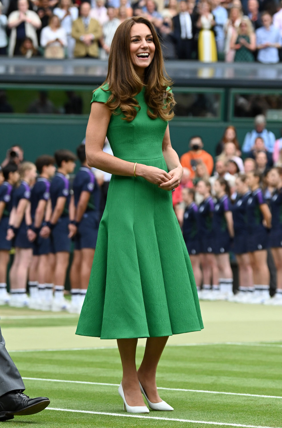 表彰式では、今年でオールイングランド・ローンテニス・アンド・クローケー・クラブの会長職を退かれるケント公とともに、キャサリン妃がプレゼンテーターを務めました。ウィンブルドンの芝をイメージしたと思われるグリーンのワンピースに、ウィンブルドンのドレスコードである「白」のハイヒールという、ぬかりのないいでだち。この日が公務再開の初日だったそうです。