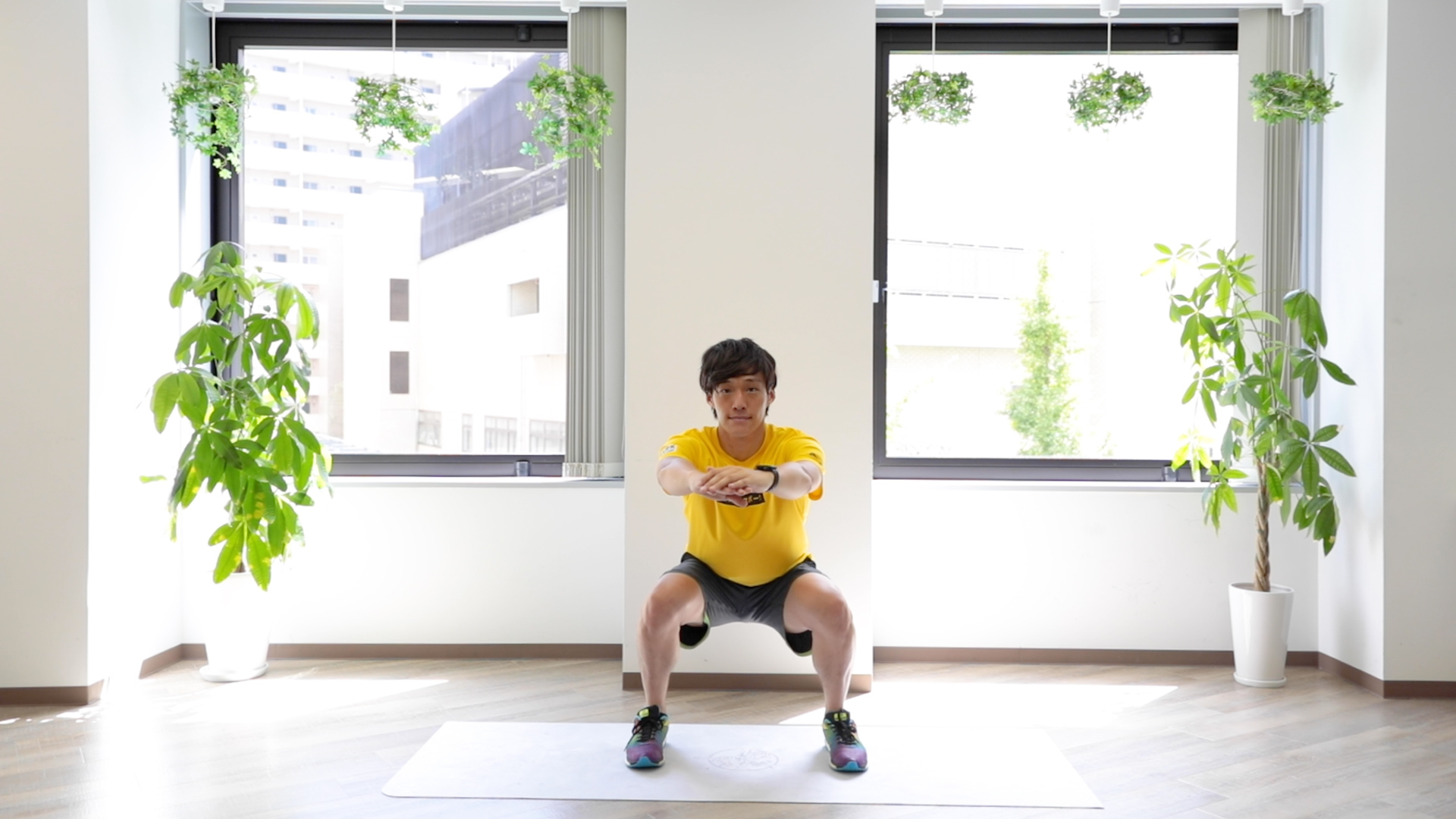 立った状態から、息を吸いながらしゃがみ、息を吐いて立ち上がりましょう。