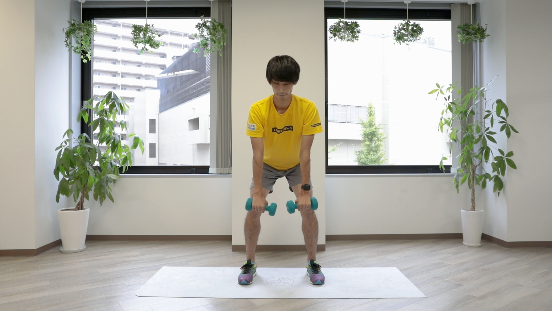 背中の筋肉を引き締める筋トレ「ダンベルデッドリフト」。ダンベルを使って広背筋や僧帽筋を効率良く鍛えられるトレーニングです。