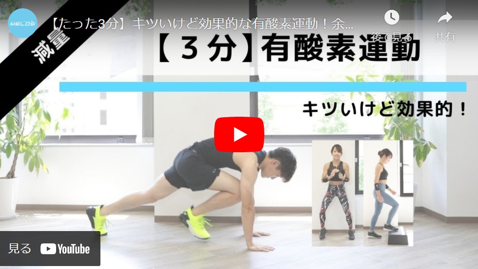 今回は、有酸素運動3種類をご紹介。「飛ばないバーピー」と「ランニングステップ」、「踏み台昇降」の3種目です。3分間で、体の余計な脂肪を燃やしていきましょう。初心者の方も、ぜひチャレンジしてください。