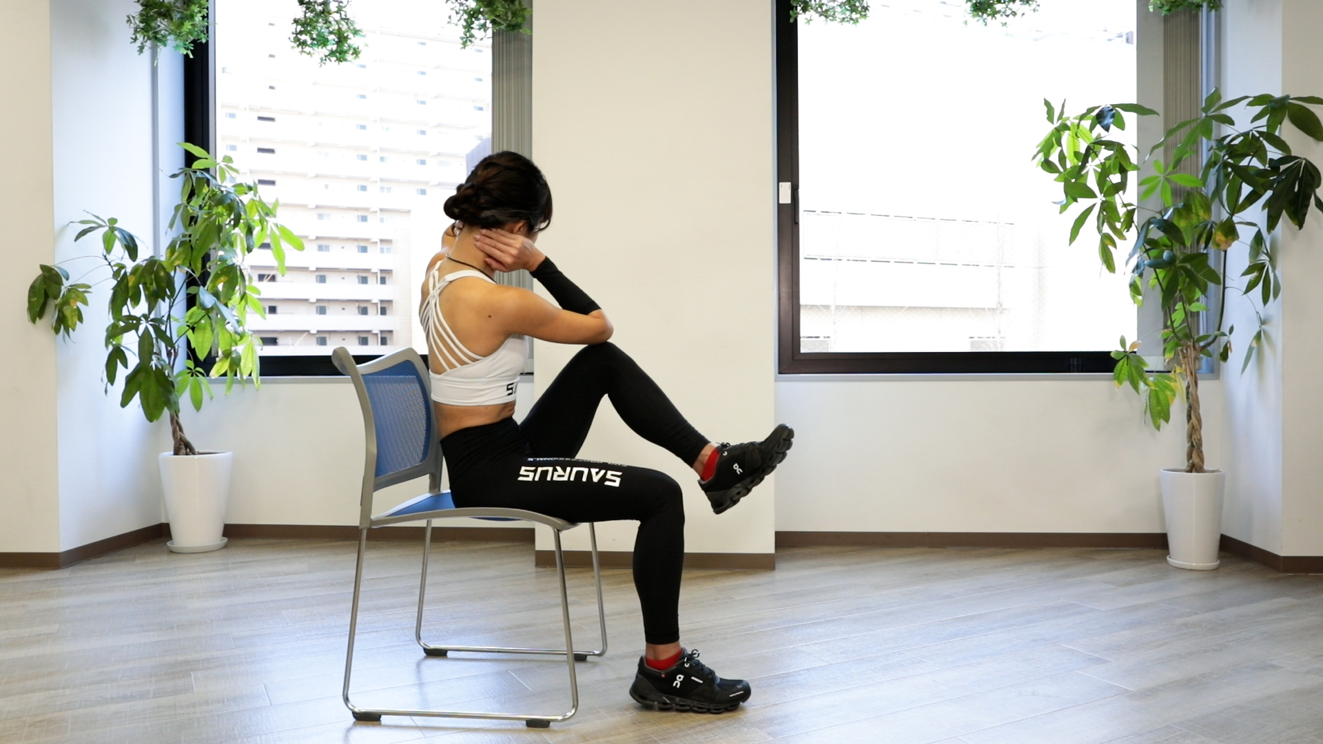 今回は「シーテッドバイシクルクランチ」の正しいやり方をご紹介。イスに座ってお腹まわりを引き締める、初心者におすすめの腹筋トレーニングです。