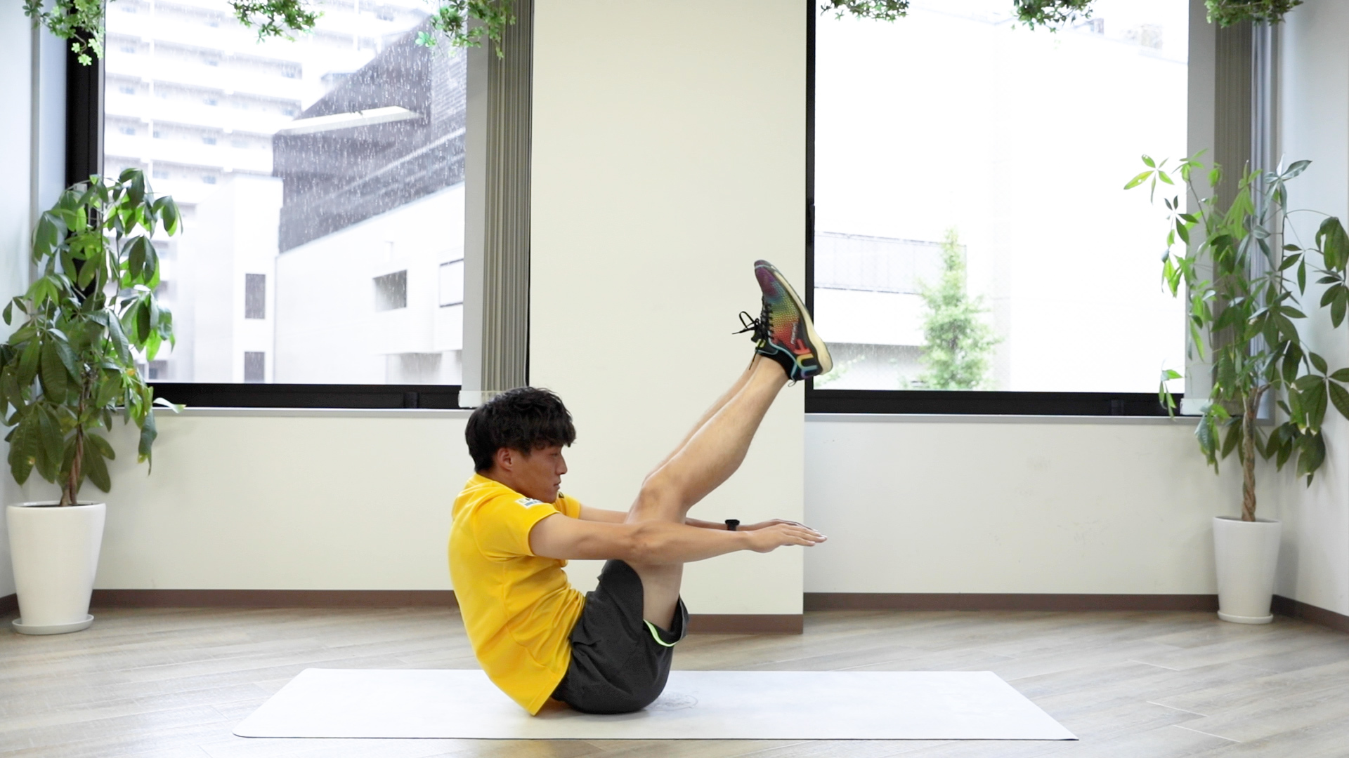 腹筋全体を一度に刺激する筋トレ「V字クランチ」。強度が高いので、筋力がある人でないと正確に行なうことが難しいトレーニングです。体を持ち上げるときに反動を使ってしまうと、腰痛を引き起こす可能性があるので注意が必要です。