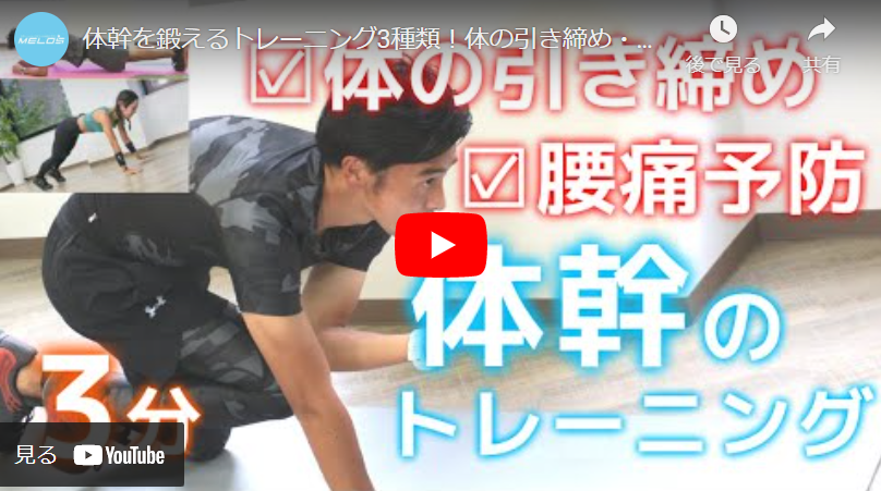 今回は、3分間の体幹トレーニングをご紹介。「ニートゥーエルボー」と「プランク」、「ハンドウォーク」の3種目です。体幹を鍛えることで、身体の引き締め効果や、腰痛予防の効果が期待できます。初心者の方も、ぜひやってみてください。