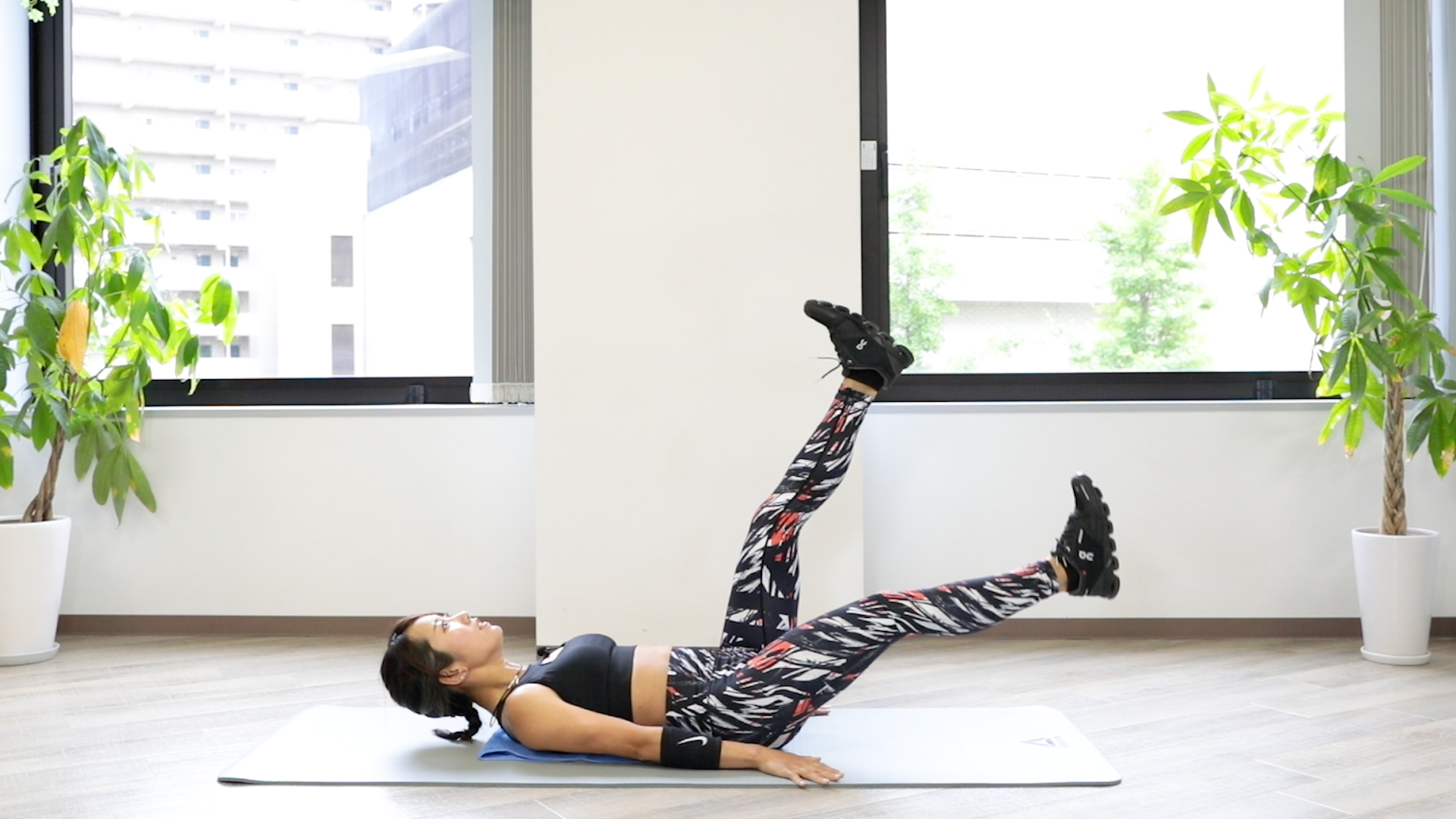 腹直筋下部をメインに鍛える「フラッターキック」。寝た状態でのバタ足は、シンプルな動作ながらも、お腹にしっかり負荷をかけることができます。