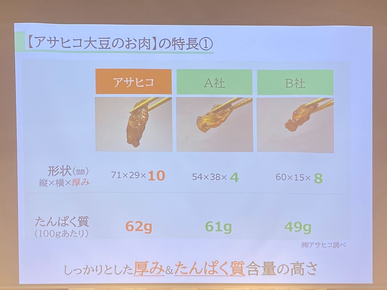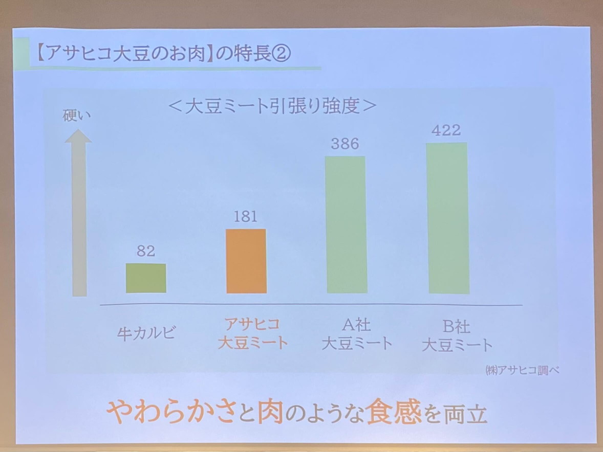 大谷さんが感動したアサヒコ大豆ミートは、アサヒコのグループ会社であるアメリカ法人で開発されたノウハウを生かし、良い部分をとり入れつつ、より日本人好みの味と食感を追求して生まれたそう。外観から厚み、ジューシーさ、引っ張ったときの強度にいたるまで細かな研究がされています。同社試験では、他社の大豆ミートと比べ、より本物のカルビに近い物性を有することが確認されています。