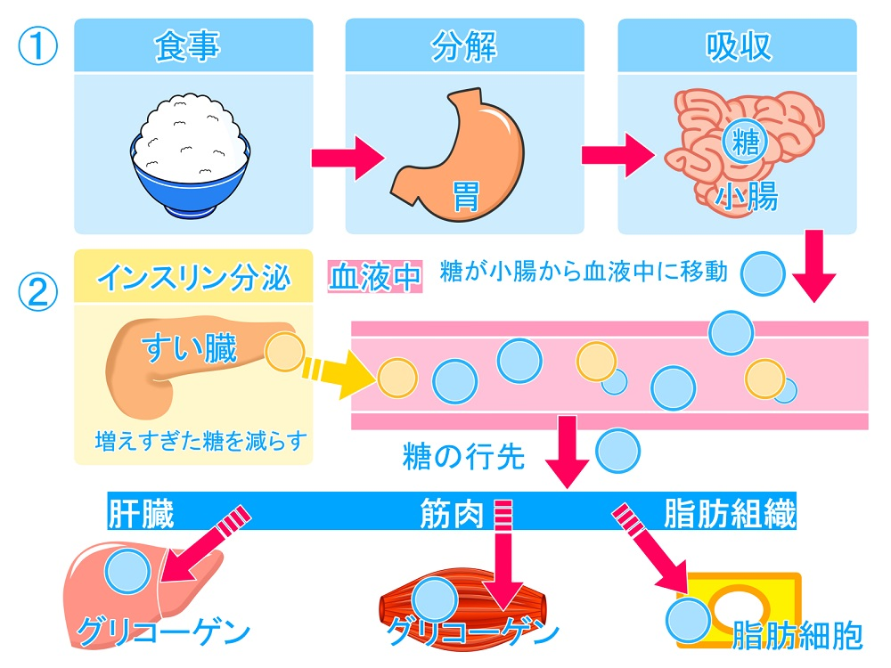 食事をすると、食品中の糖質が分解・吸収されグルコースという形で血液中に流れます。そうすると、血液中のグルコース濃度が濃くなる、すなわち血糖値が上がります。