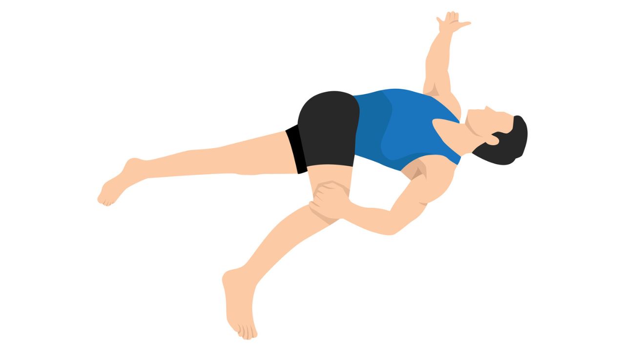 - 息を吐きながら、ゆっくりと両手で左ももを手前に引き寄せ、右ひざを前方に押します。このとき、右のお尻が浮かないように気をつけましょう。