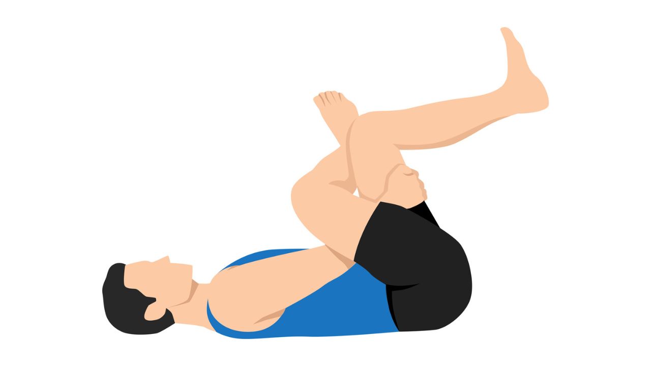 - 仰向けになり、右ひざを曲げて胸に引き寄せます。