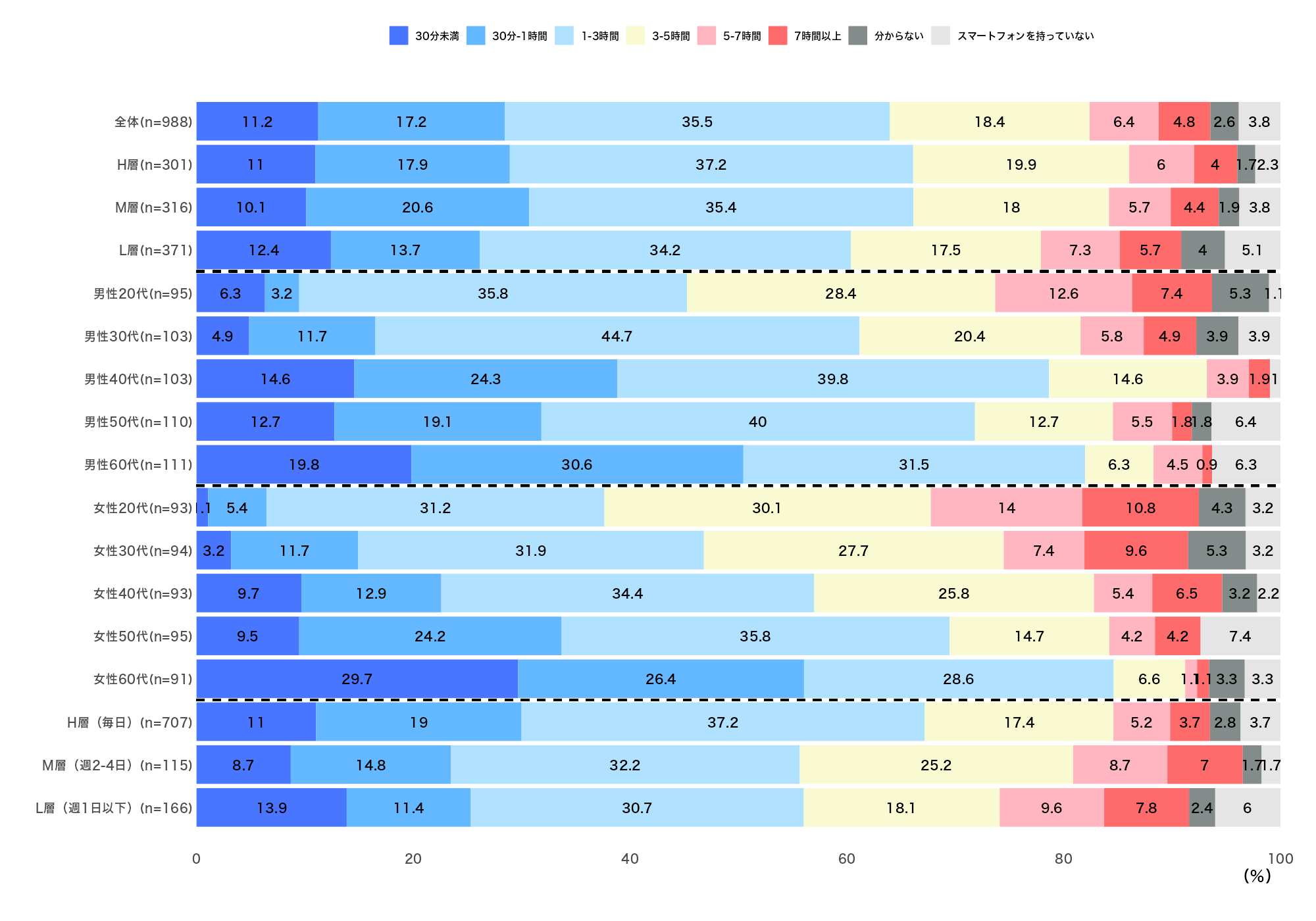 男性20代にはスマホを長時間使用する人の割合が多く、長時間使用が睡眠時間の減少や不規則な生活リズムを引き起こし、結果として朝食頻度低下に影響を及ぼしていると言えそうです。