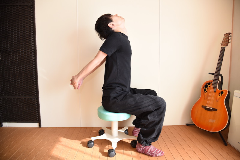 まず、両手を背中で組んで鼻から息を吸います。次に息を吐きながら、首を後ろに伸ばして天井を真っ直ぐに見上げます。息を吐き終わったら、体を元の姿勢に戻します。首と肩を悪い姿勢から戻し、手元よりも遠くにある天井を見ることを忘れずに。