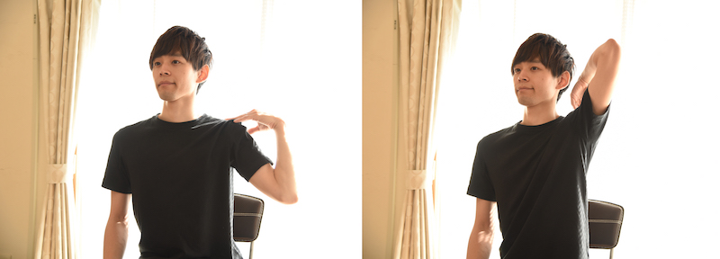 ▲指先を肩に置いたまま(写真左)、肩を大きく回す(写真右)