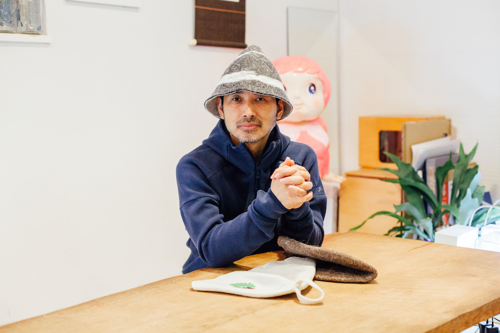 ▲お洒落なサウナハットを被るタナカさん。サウナハットは、サウナ室内で頭が熱くなりすぎないようにするためのサウナー御用達アイテム