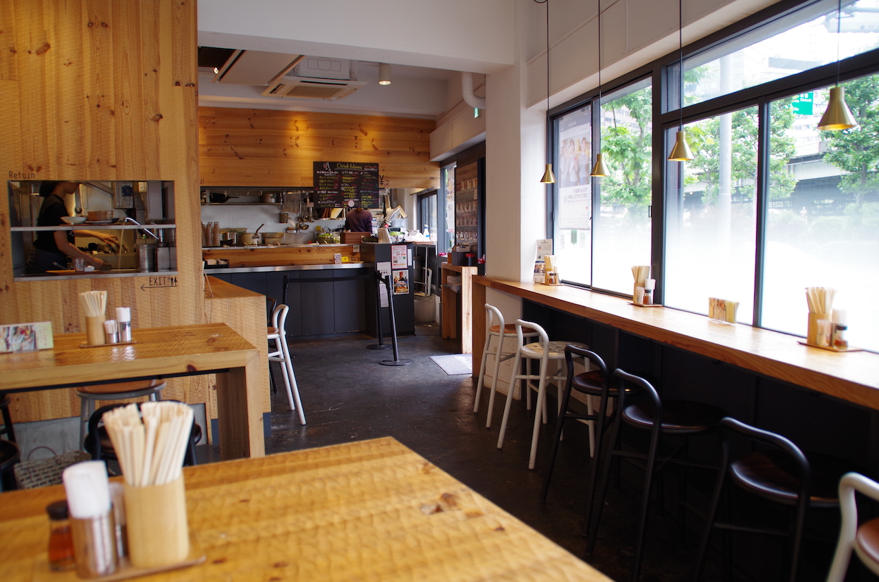 お店に入ると、木を基調とした広い店内が。テーブル席とカウンター席が設けられているので、お一人様でも気兼ねなく入れます。店内には、大きな窓から明るい陽の光が射し込んでいました。これは、ゆったりと寛いで食事が楽しめそうです。