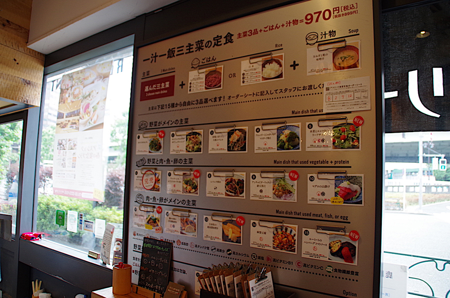 入口を入ってすぐの場所に、『一汁一飯三主菜の定食』と書かれたプレートが。そこには、ごはんと汁物に合わせ、以下3つの項目に分けて各5つのおかずが掲示されています。