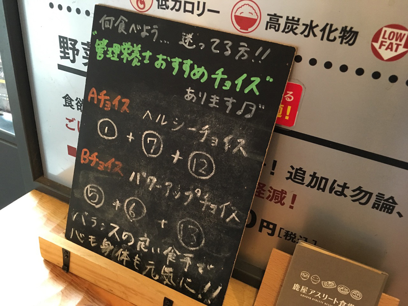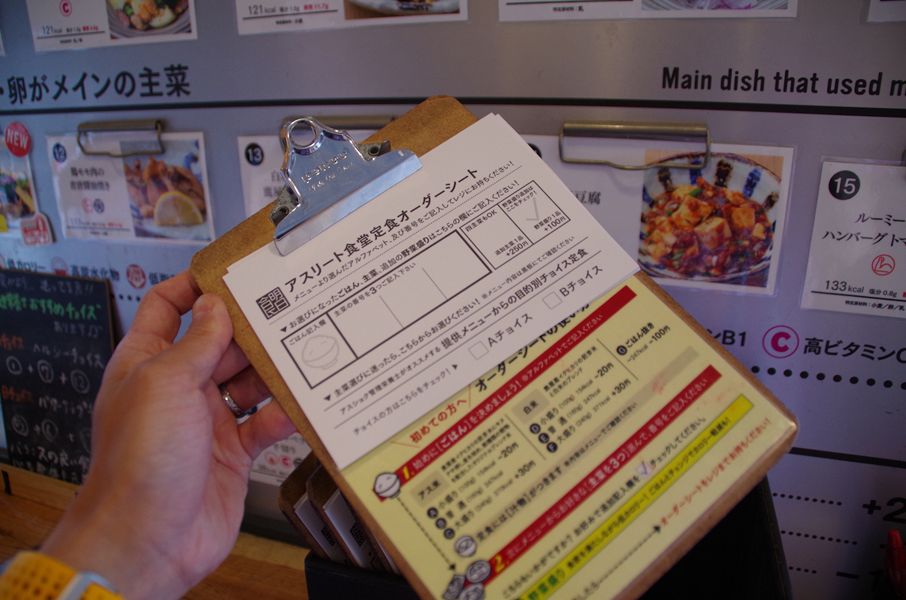 この中から3つのおかずを選んで、自分の食べたいメニューをオーダーシートに記入する仕組み。ごはんも通常の白米のほか、オリジナルブレンドで作っているアス米を選べます。尚、各メニューには含まれる栄養について記号が記されている(例えばビタミンCの豊富なメニューは『C』など)ので、これを目安に組み立てるのがオススメです。