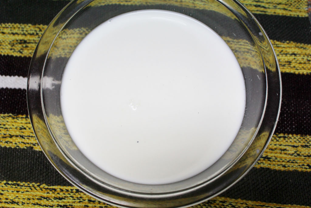 鍋に牛乳を入れて火にかけ、60度に温めます。電子レンジで温める場合は、大きなボウルに牛乳を移して600Wで1分ほど温めてください。