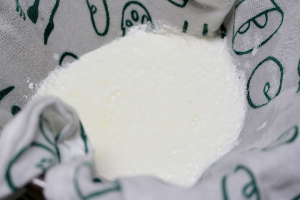 ホエイを取り除いたカードをガーゼで包み、水に入れて絞りながら、水が白く濁らなくなるまで洗い続けます。水分を絞りきったら、あとは揉みしだいて好みの固さにしあげていきます。