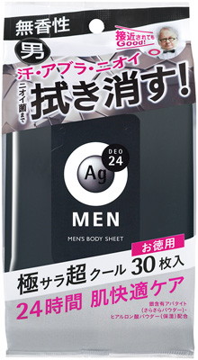 汗、アブラ、ニオイ菌まで拭き消せるのは、『エージーデオ24メン メンズボディーシートNb』。拭いた瞬間、クールでさらさら感が続きます。