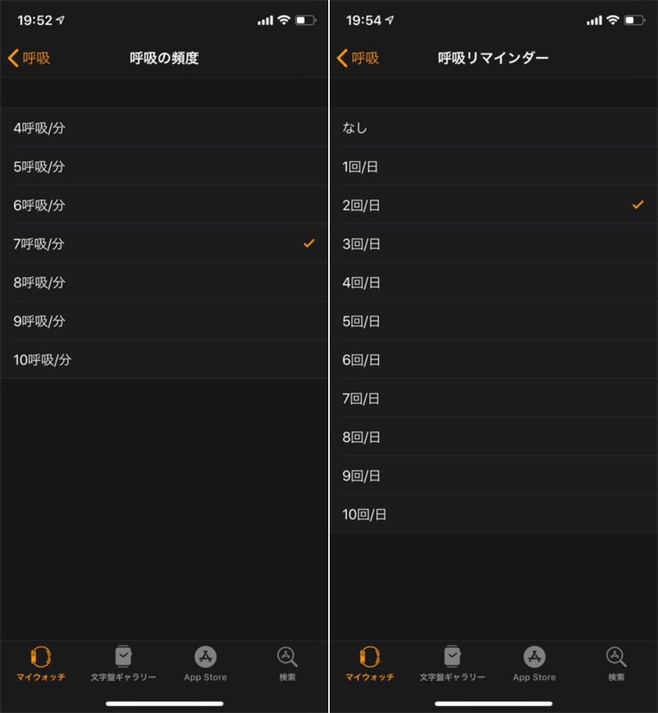 ▲呼吸アプリの頻度や、1日の間にリマインドしてくれる回数はiPhoneのWatchアプリで設定可能