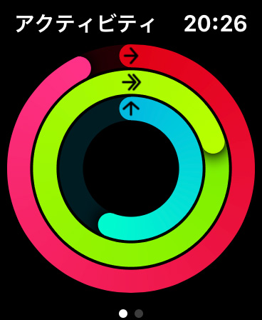 ワークアウトアプリの成果は、もうひとつのwatchOSの標準アプリである「アクティビティ」と連動しています。アクティビティはスタンド/ムーブ/エクササイズという3つの指標から、毎日の活動状況をApple Watchの画面上にリングで“見える化”してくれるアプリです。