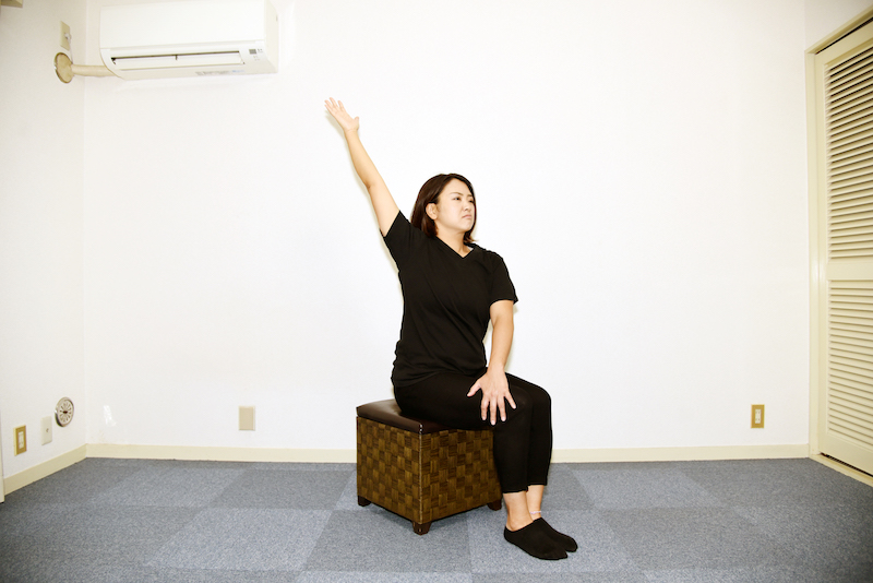 椅子の上に真っ直ぐに座り、片手で足を固定します。もう一方の手を真っ直ぐ上にあげ、そこから後ろに倒します。5回ほど倒したら、一番倒した状態で止まり、息を大きく吐きます。手を後ろに伸ばす動きは普段はしないのですが、その動きをすることで、日頃から猫背の姿勢に固まってしまっている腕や、肩や、背中をほぐします。