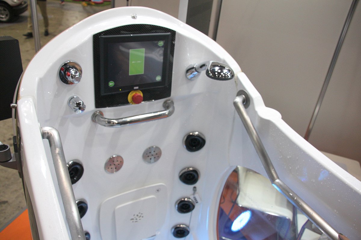 アクアトレーニングの後には、備え付けのシャワーヘッドを使ってシャワーを浴びることができます。また、スパ入浴にも対応。折りたたみのチェアを引き出して腰をかけ、ジャグジーで身体をゆっくり休めることができます。ちなみに水・湯を貯めるタンクは2層になっており、アクアトレーニング用の水は塩素消毒・紫外線殺菌により循環させることが可能、スパ入浴用の湯は使い捨てとのことでした。