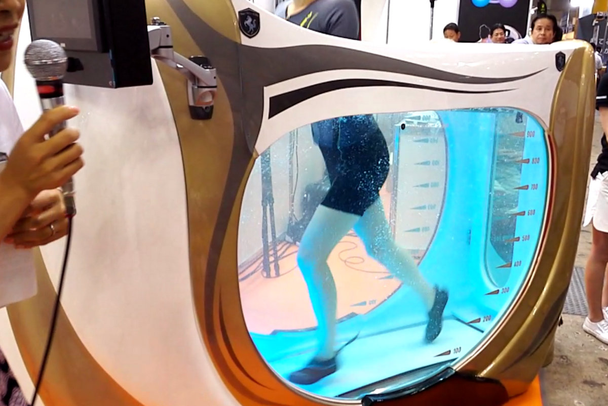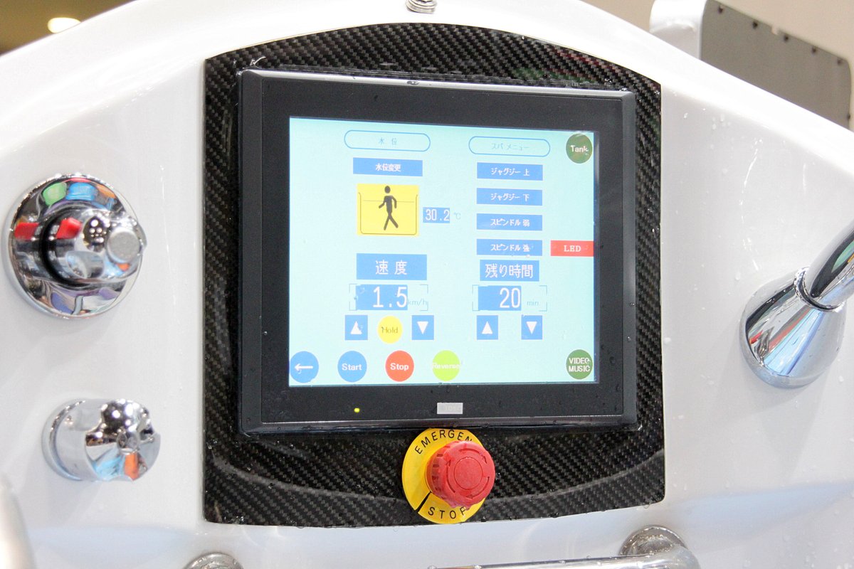 ブースでは、デモが行われていました。水を満たした機器の中でジョギングを行う女性。床面はルームランナーのように動く仕組みで、その速さはタッチパネルで自由に変えられます。ちなみに最大で11km/hまでのスピード調節が可能。このときスピンドルジェット2基、強力流水ジェット14基からは、抵抗力としてジェット噴射が流れます。スタッフによれば、ちょうど川をさかのぼるような感覚があるそうです。なお同社では、フィットネスメニューをプログラムしたオリジナルソフトも開発中とのことでした。