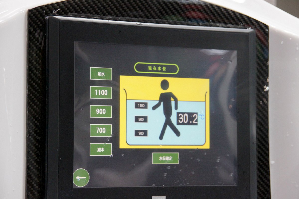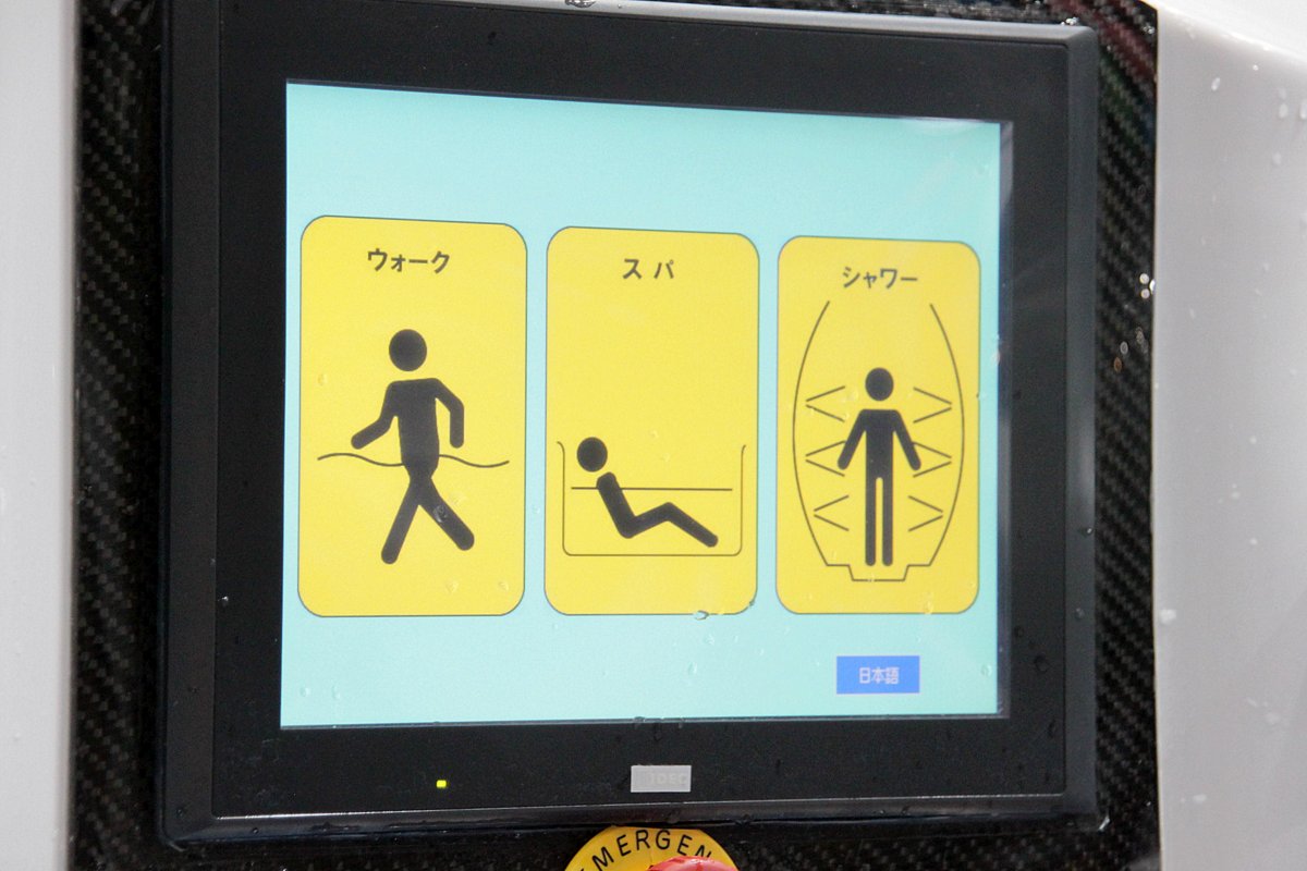川をさかのぼるような感覚で水中運動(有酸素運動)が可能。腹にジェット噴射を当てることで、ボディの引き締め効果もあるとのこと。タッチパネルで操作を行います
