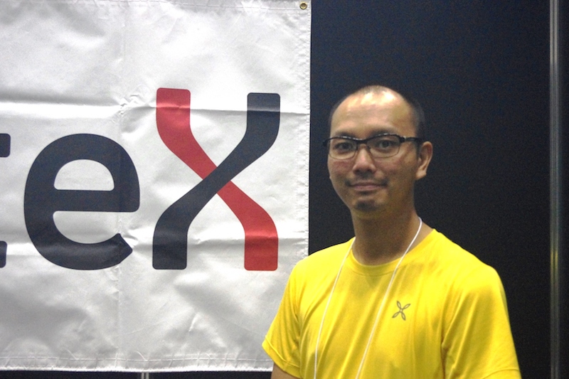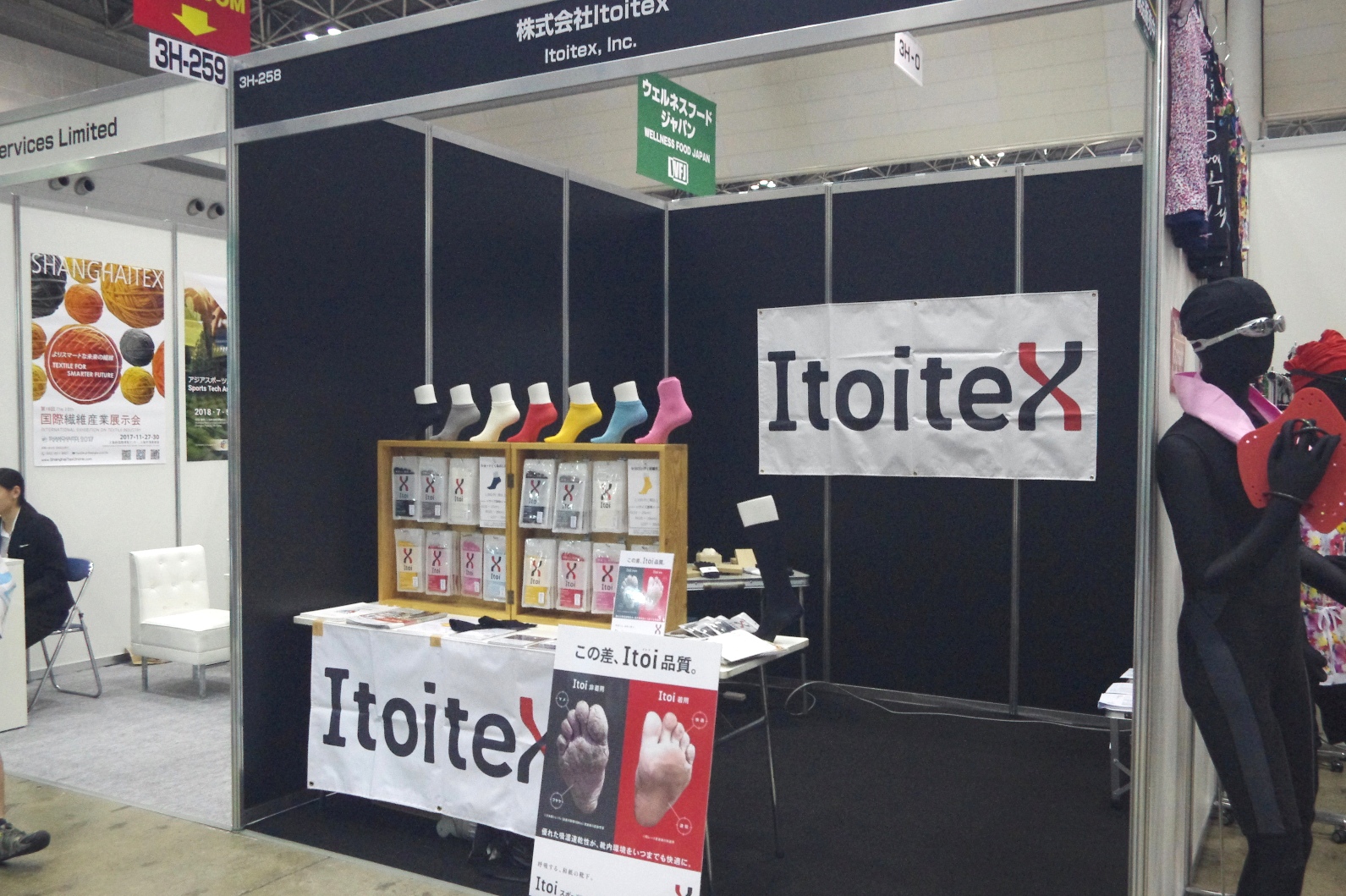 カラフルなソックスのディスプレイ。福岡に本社を置くスポーツ用品メーカー「Itoitex」のブースです。ここを通りかかったときにまず目に入ってきた、このポップ……。