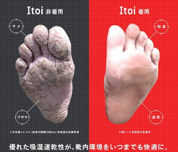 「Itoitexのソックスを着用したランナーと他社のソックスを着用したランナーが、同じトレイルランニング(120km)を走り終えた後の足裏の比較写真です。Itoitexのソックスは和紙でできているんです」