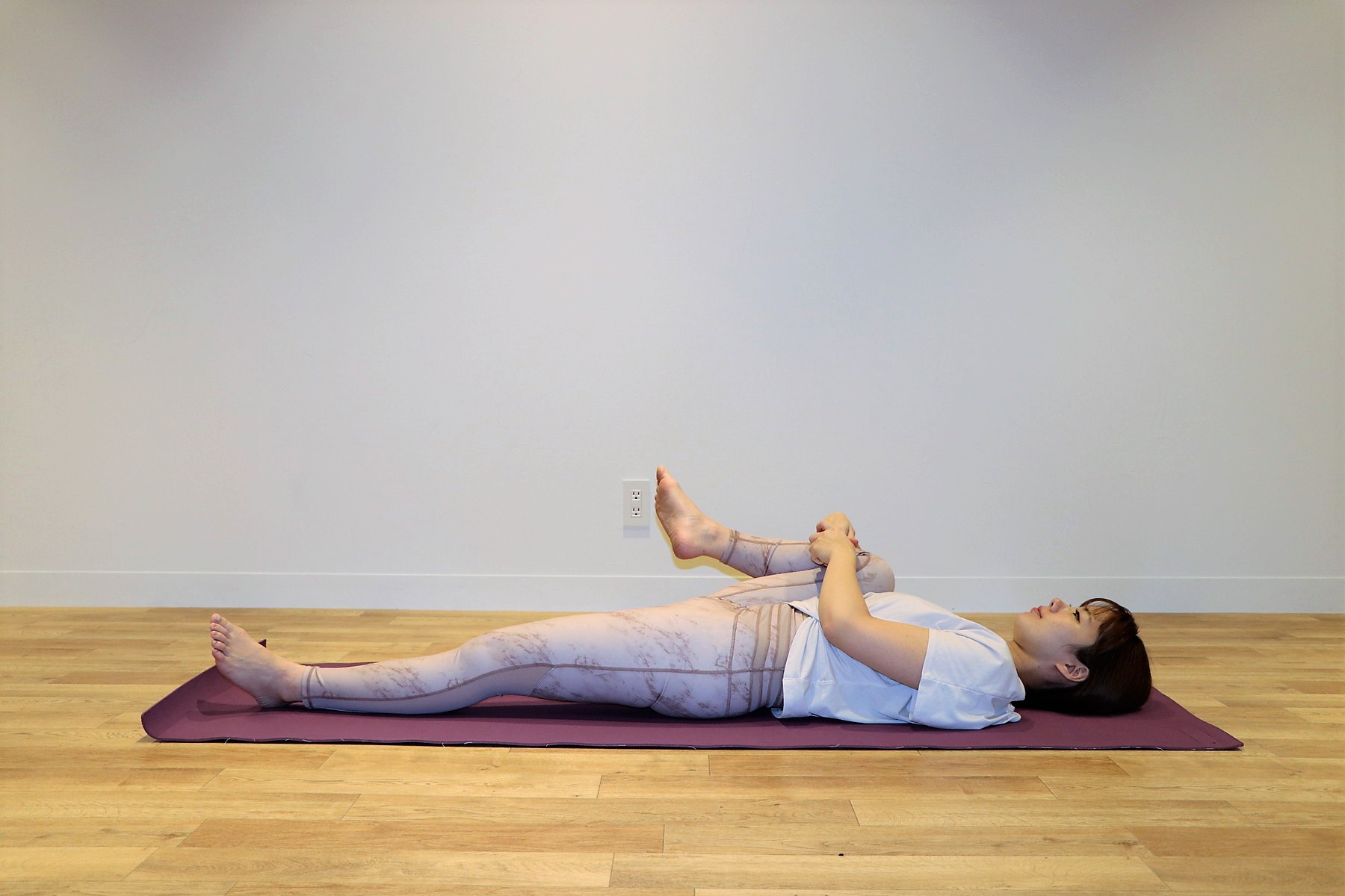 2.息を吸いながら、右ひざを胸の方に引き寄せ、両手で抱える