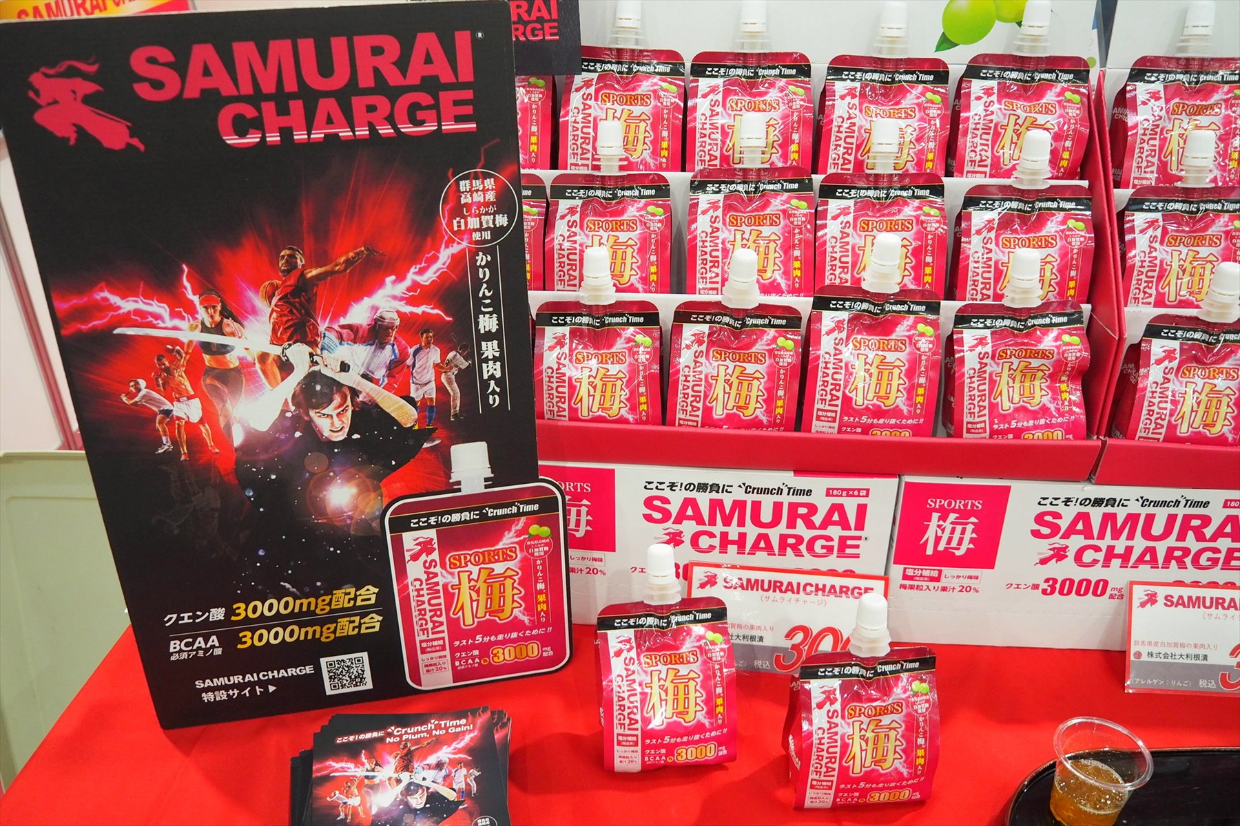 群馬県の漬物屋・大利根漬が展示していたのは、かりんこ梅の果肉入りスポーツゼリー飲料「SAMURAI CHARGE」(サムライチャージ)でした。クエン酸3,000mg、BCAA必須アミノ酸3,000mgを配合しています。