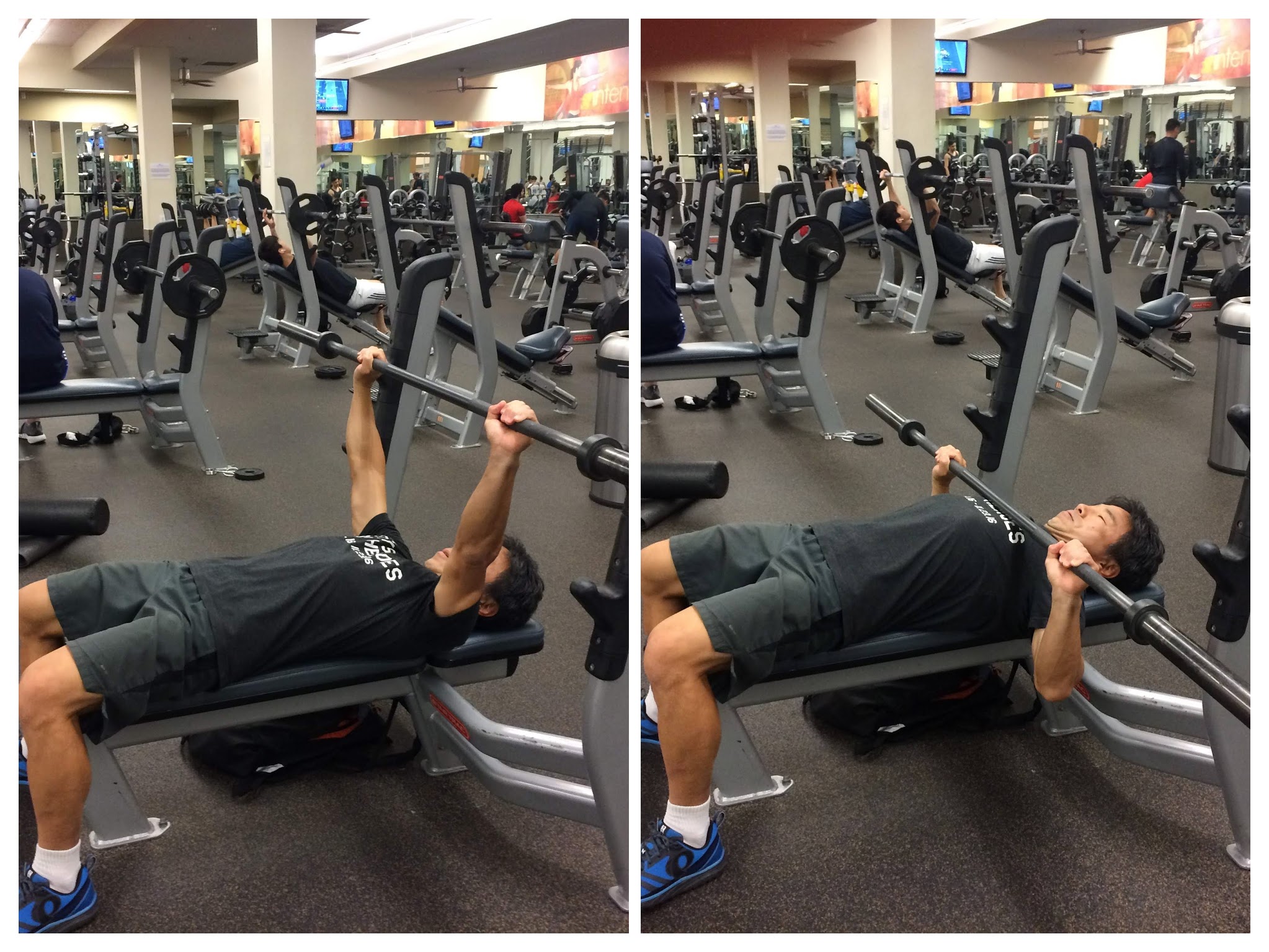 ベンチプレスでは息を吸いながらバーを下ろし、息を吐きながらバーを上げる